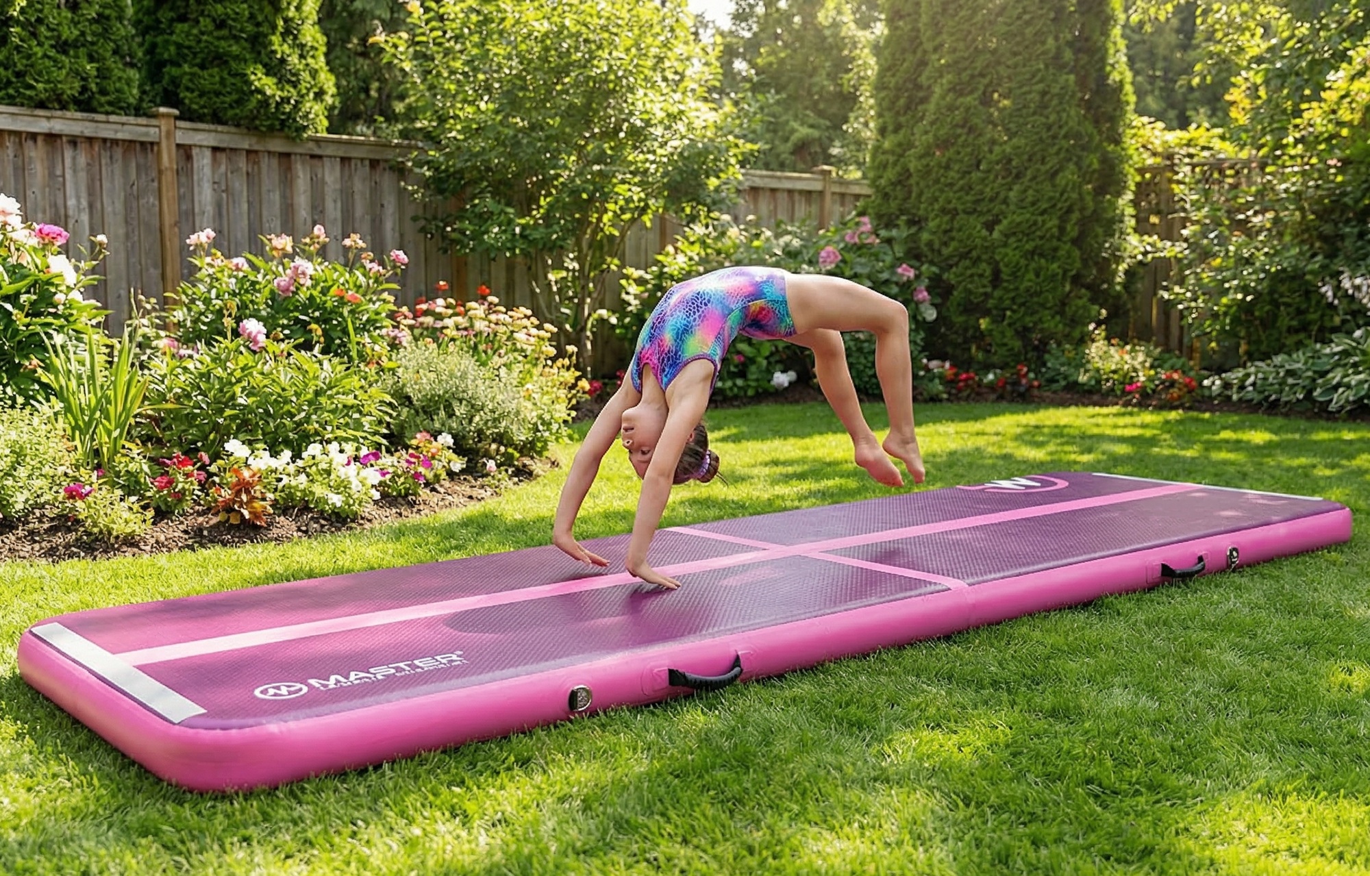 Airtrack MASTER pozwala na płynne przejście z trampoliny na ziemię, umożliwiając naukę salt, przewrotów i innych ewolucji w komfortowych warunkach. Jest doskonały do gimnastyki, parkouru, tańca, sportów walki oraz wszelkich aktywności wymagających amortyzacji. Możesz go używać w sali treningowej, w ogrodzie, a nawet nad wodą – materiał i klej są odporne na wilgoć, dzięki czemu airtrack można zabrać na basen lub nad morze.