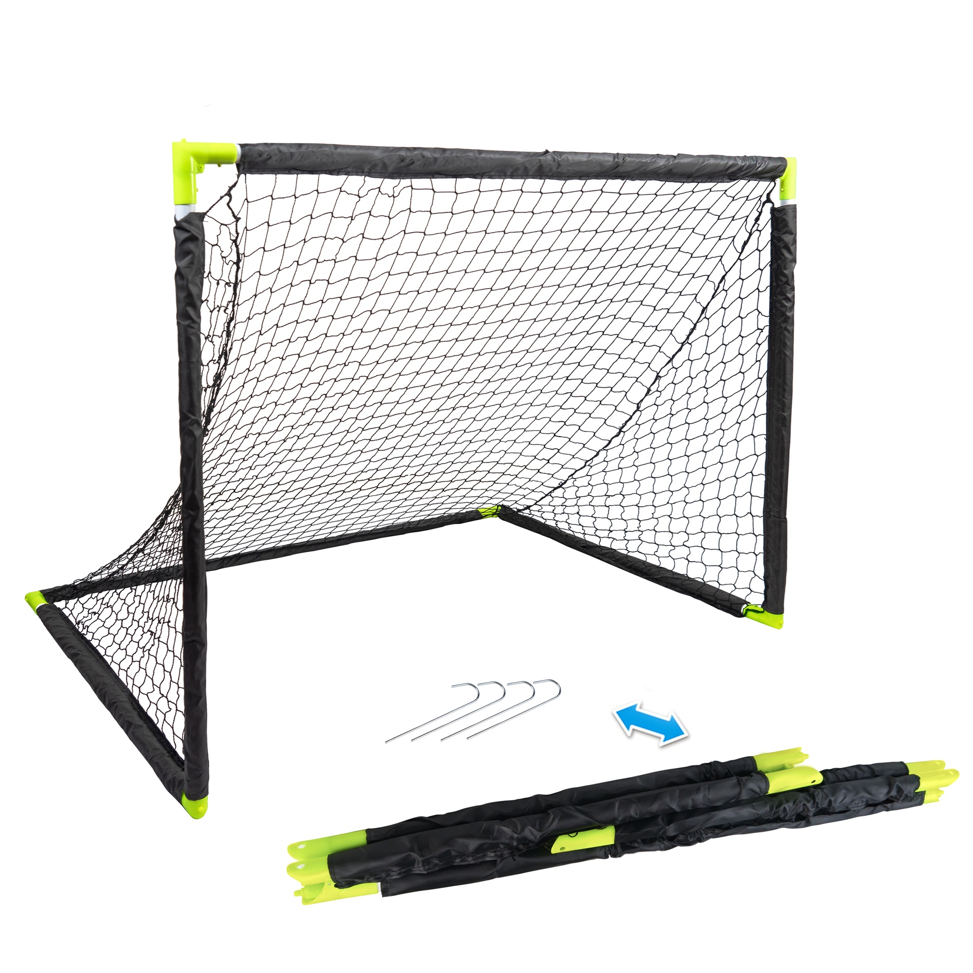 Bramka nadaje się do użytku wewnątrz pomieszczeń oraz na zewnątrz – w ogrodzie, na boisku czy podwórku. Wytrzymała siatka z polietylenu oraz kołki mocujące zapewniają stabilność podczas gry i strzałów na bramkę.