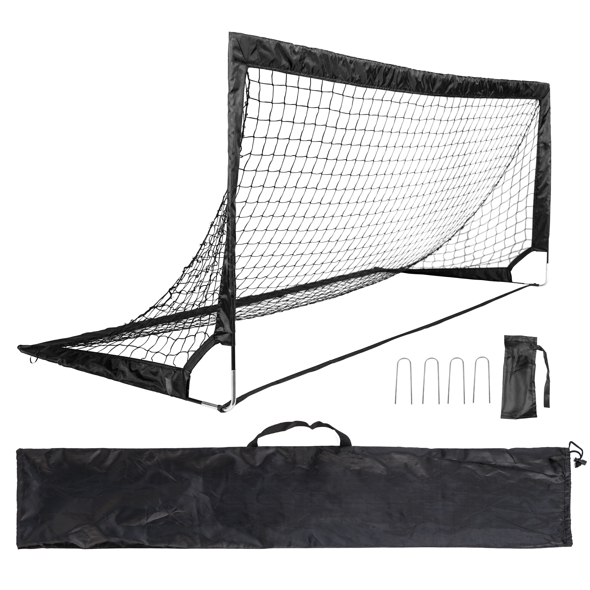 Dzięki pomysłowemu systemowi kołków montaż bramki o wymiarach 200 × 90 × 90 cm zajmuje tylko chwilę – bez użycia narzędzi. Wytrzymała nylonowa siatka sprawdzi się zarówno podczas rekreacyjnej gry, jak i intensywniejszych treningów. W zestawie znajdują się metalowe haki, które umożliwiają pewne zakotwiczenie bramki w podłożu, zwiększając bezpieczeństwo i komfort gry.