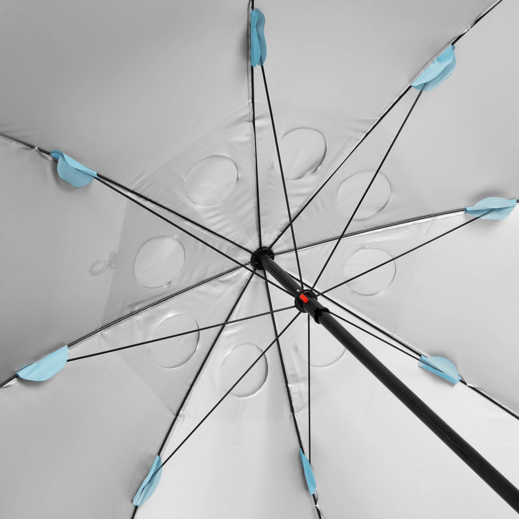 Parasol wyposażono w odpinaną podłogę o wymiarach 250 x 140 cm, która zapewnia dodatkowy komfort użytkowania. Idealnie izoluje od piasku lub wilgotnego podłoża, tworząc czystą i bezpieczną przestrzeń do relaksu, zabawy dla dzieci czy przechowywania rzeczy. W razie potrzeby podłogę można łatwo odpiąć – parasol staje się wtedy klasycznym zadaszeniem.