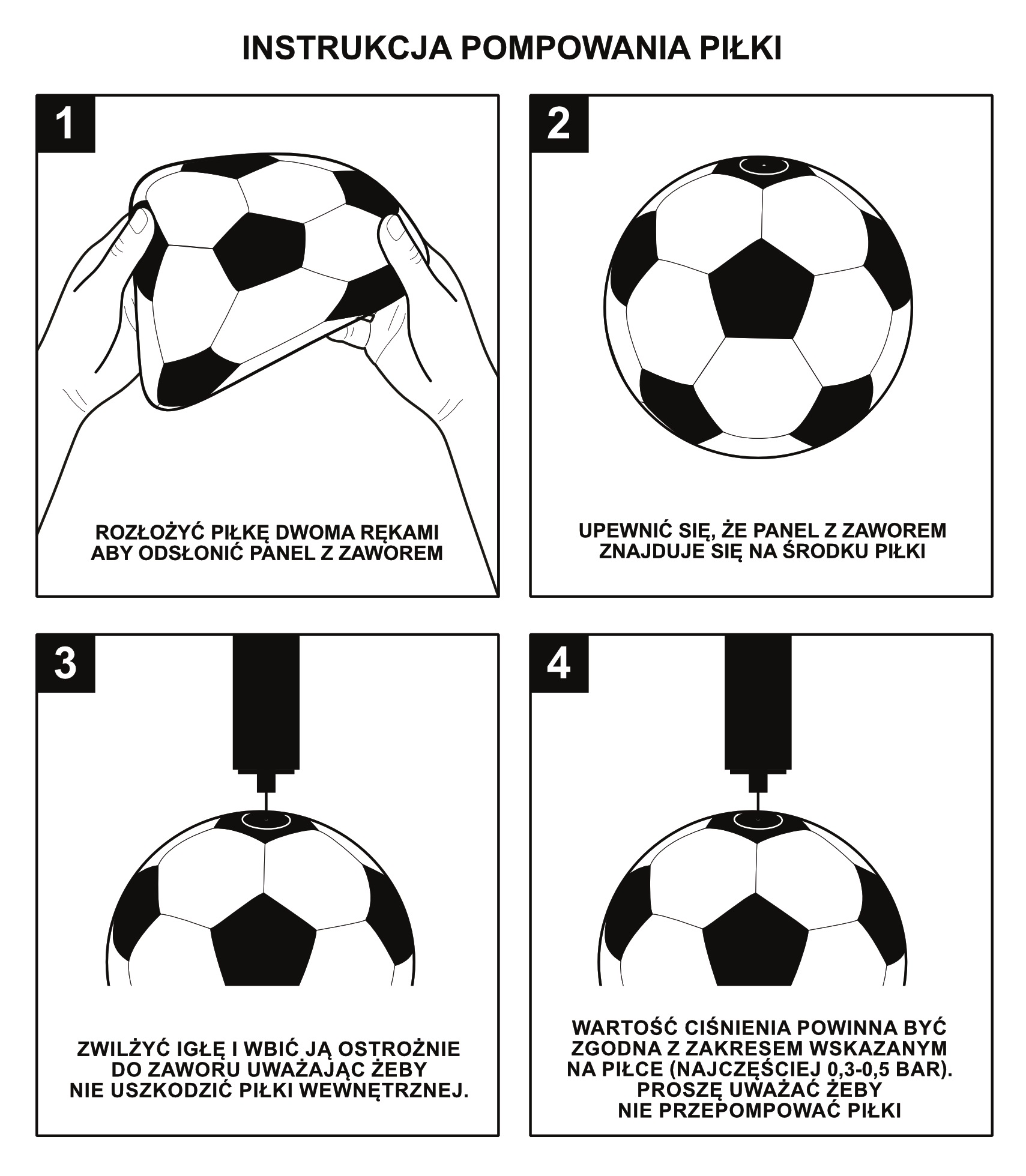 Uwaga: Piłkę należy pompować po wcześniejszym rozłożeniu jej i tylko zwilżoną wcześniej igłą! Pompowanie suchą igłą może trwale uszkodzić wentyl.