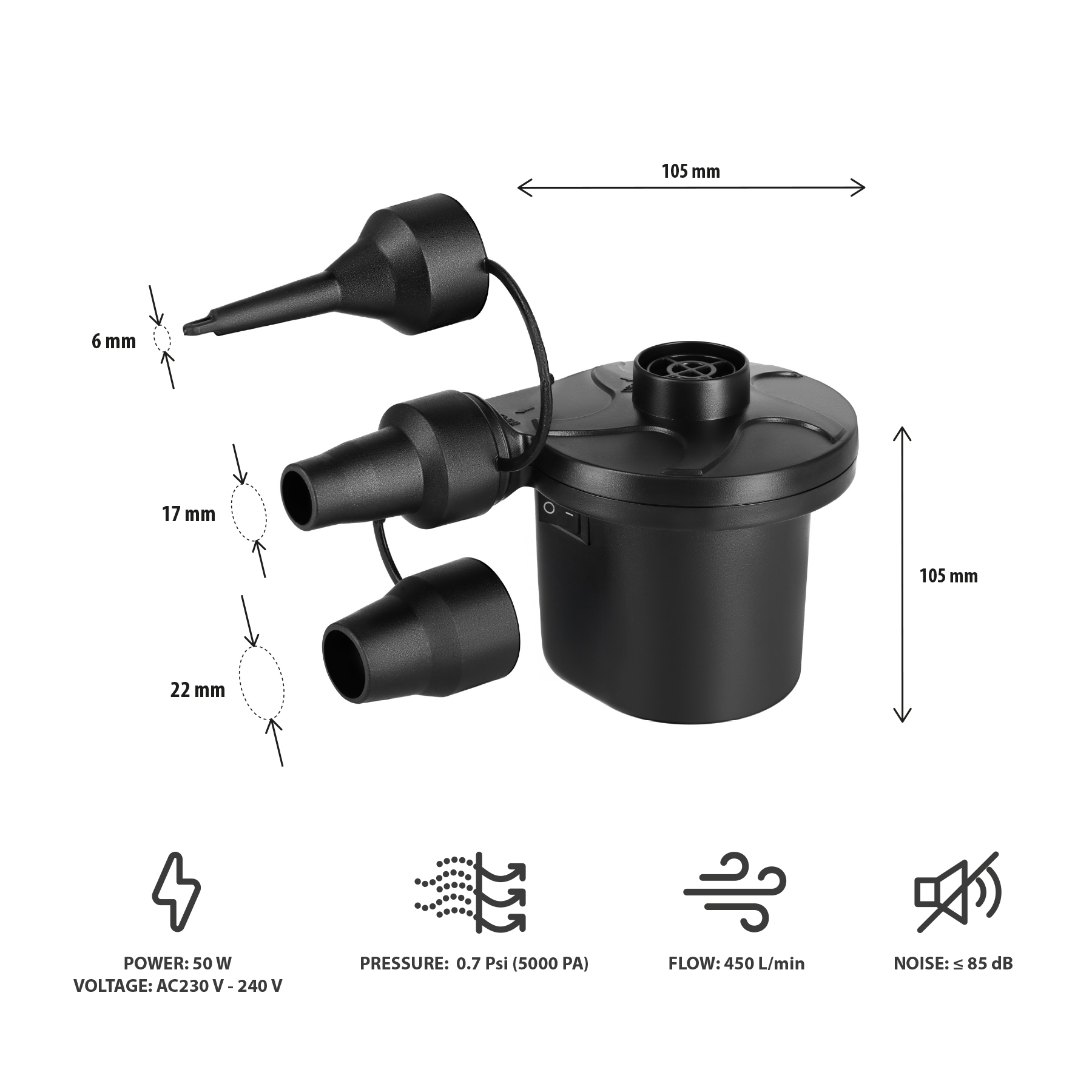 Urządzenie osiąga przepływ powietrza na poziomie 450 litrów na minutę, co pozwala błyskawicznie napełnić powietrzem nawet większe akcesoria dmuchane. Ciśnienie robocze zapewnia odpowiednią twardość pompowanych przedmiotów, a maksymalny poziom hałasu nie przekracza 85 dB, co czyni pompkę wygodną w codziennym użytkowaniu.