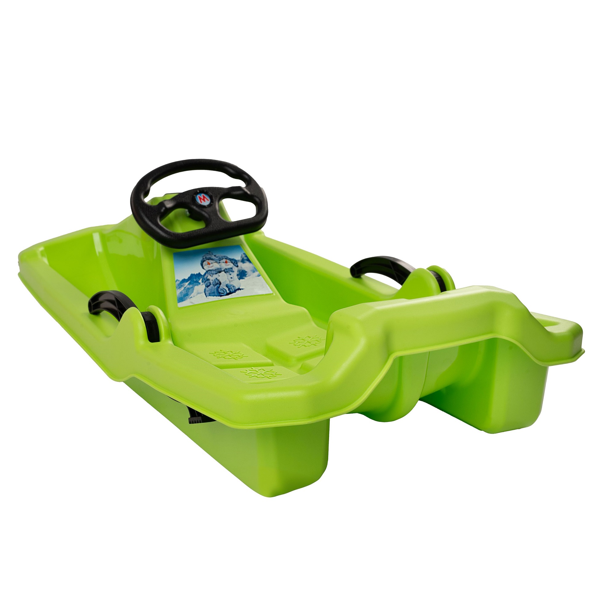 Sanki plastikowe dla dzieci z kierownicą i hamulcami - zielone - to doskonały wybór dla młodych miłośników zimowych przygód. Idealnie sprawdzą się podczas zabaw na śniegu, umożliwiając dziecku łatwe i bezpieczne zjeżdżanie z górki.