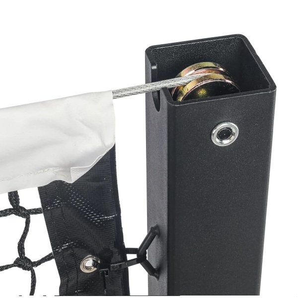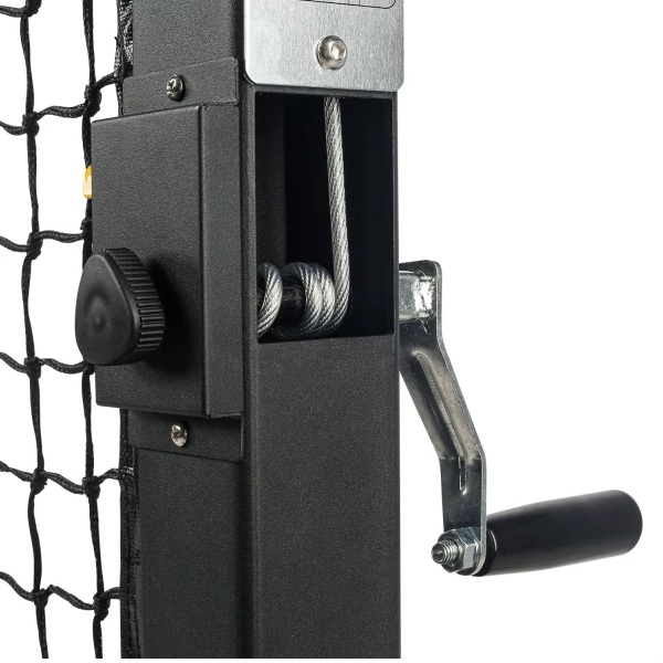 Siatka ma standardową długość 6,5 m, a dodatkowe 30 cm po obu stronach zapewniają większy zasięg i komfort gry. System napinania z linką stalową i korbą ręczną umożliwia precyzyjne ustawienie wysokości 91 cm po bokach i 86 cm w środku dzięki środkowemu paskowi regulacyjnemu.