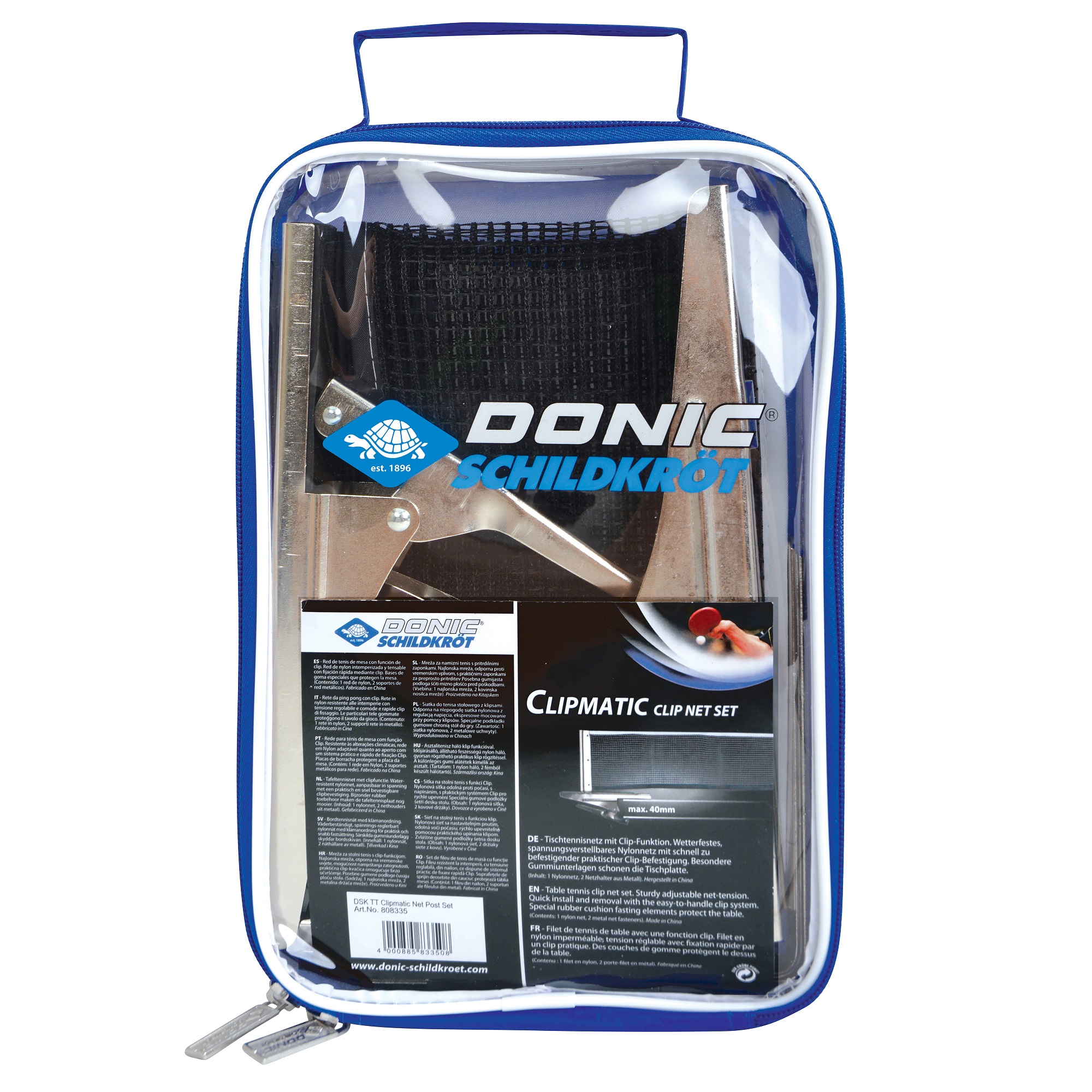 Siatka do tenisa stołowego DONIC Clipmatic to popularna siatka renomowanego producenta. Prosta metalowa konstrukcja z praktycznym mocowaniem na klips nie wymaga skomplikowanego montażu do blatu. Siatka przeznaczona jest do stołów o grubości blatu do 40 mm. W zestawie znajduje się nylonowa siatka z regulacją naciągu. Całość zapakowana jest w praktyczną torbę z suwakiem i uchwytem do przenoszenia.