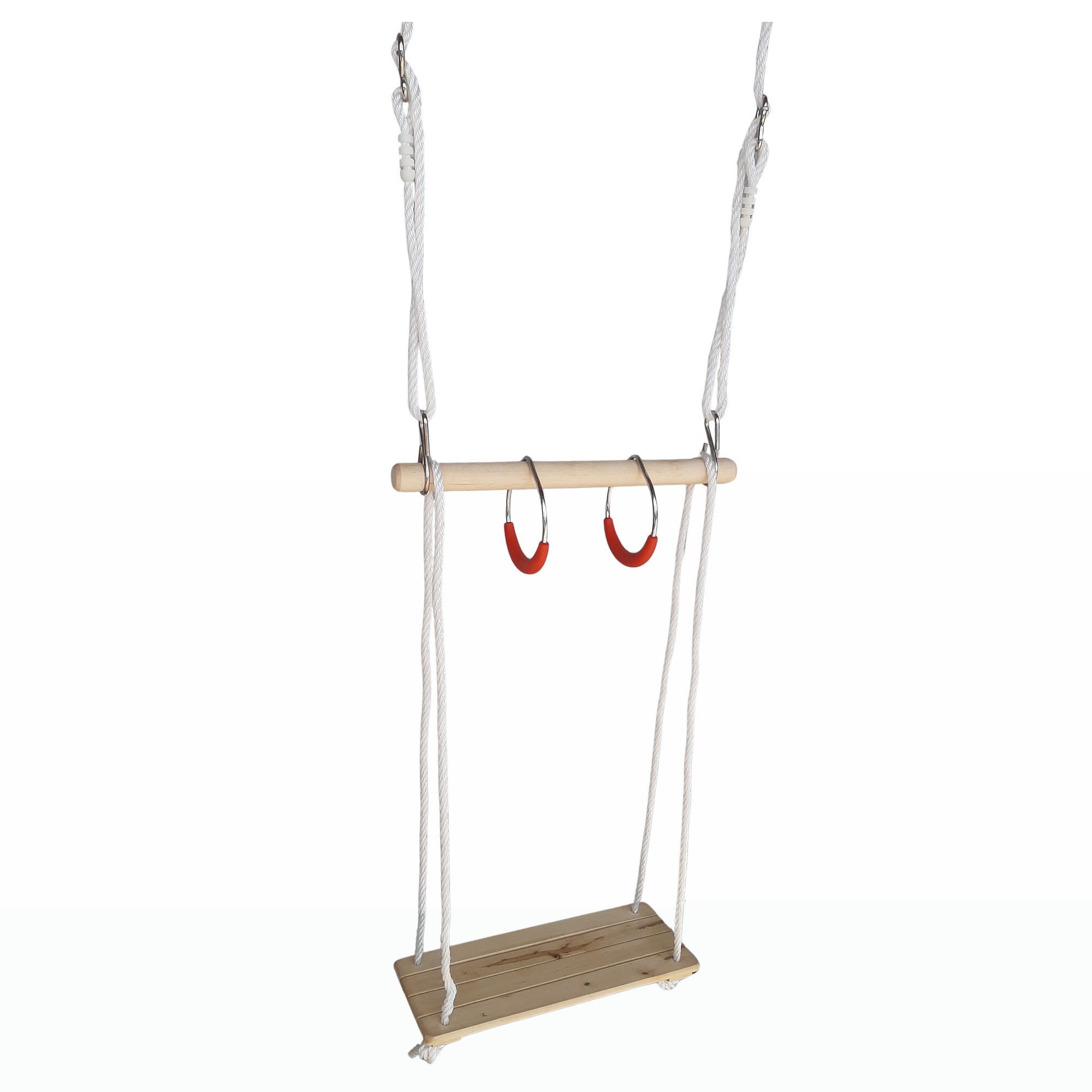 Huśtawka z drewnianym siedziskiem, przeznaczona zarówno do użytku wewnętrznego jak i zewnętrznego. Można ją zamontować w domu na witrynie lub w ogrodzie na świeżym powietrzu.